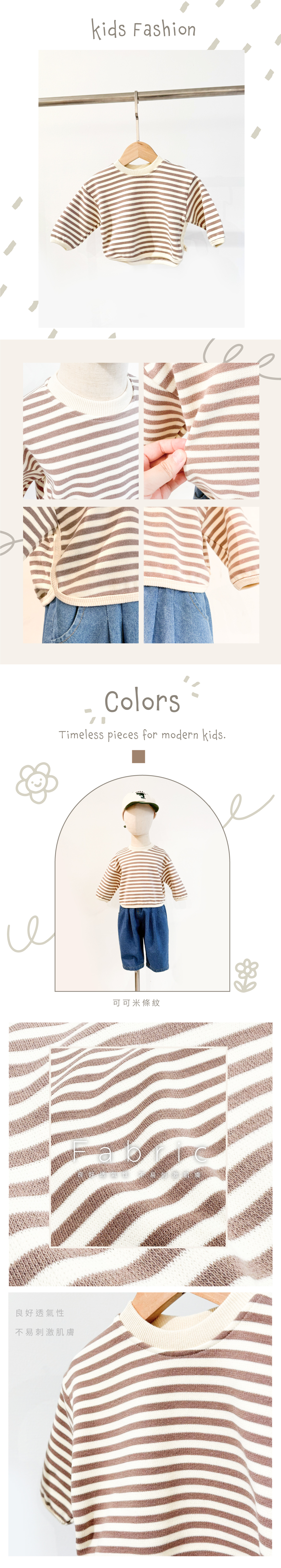 ▹ 奶茶與可可色的經典條紋搭配,簡約又不失可愛感。圓領與袖口羅紋設計,保暖又方便穿脫。