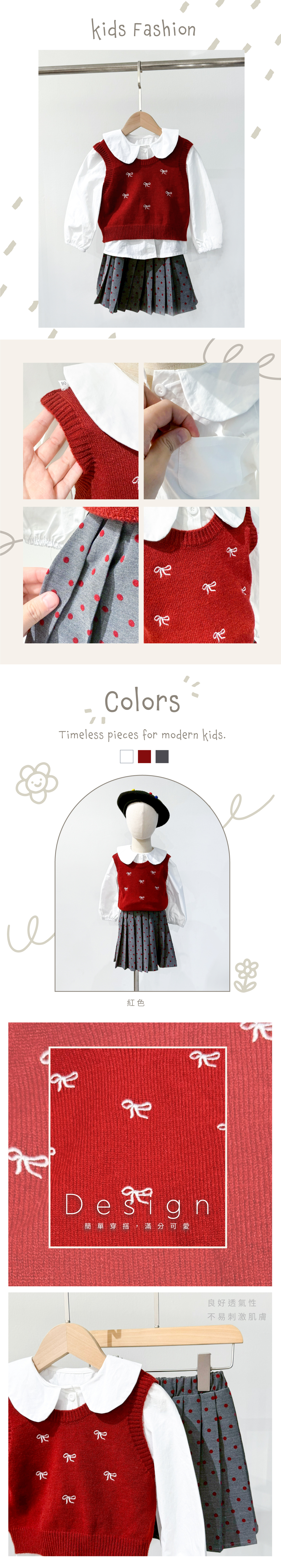 ▹ 由白襯衫、紅色針織背心與格紋百摺裙組成,溫柔中帶點俏皮、甜美又有層次感。