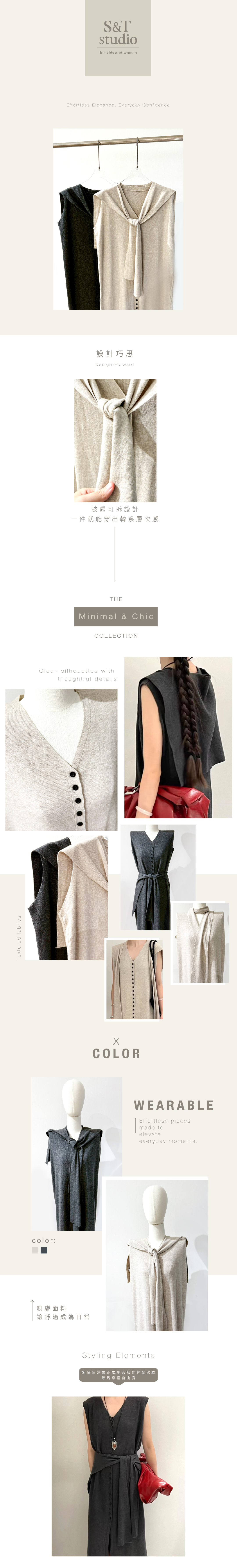 V領設計修飾頸部線條,前排包扣與開衩細節增添層次感,無論單穿或疊搭外套都極具造型感。