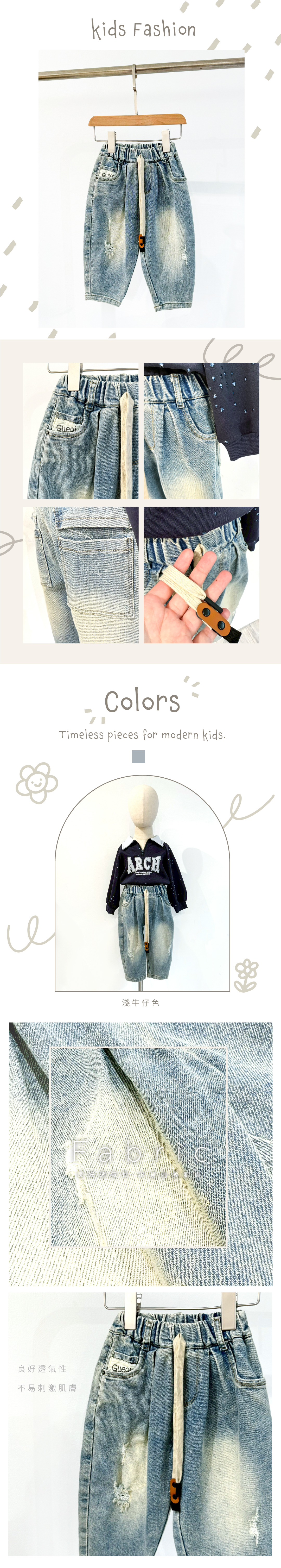 ▹復古刷色牛仔褲,搭配自然割破設計,展現童裝少見的個性風格,腰部彈性設計搭配抽繩,穿脫方便、活動自在,是日常穿搭的百搭選擇。