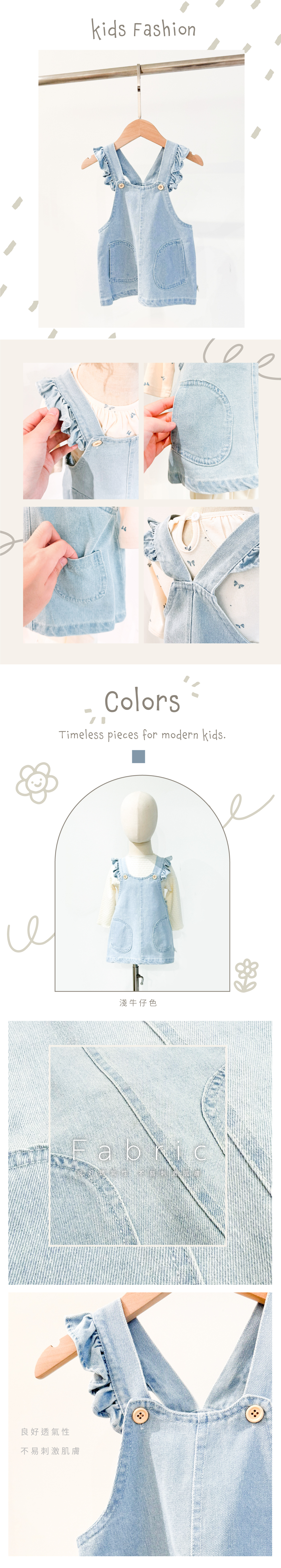 ▹ 讓日常穿搭多一點俏皮感。選用柔軟舒適的水洗丹寧布,搭配可愛的木耳邊肩帶設計,細節感滿分,為寶貝增添甜美又活潑的風格。