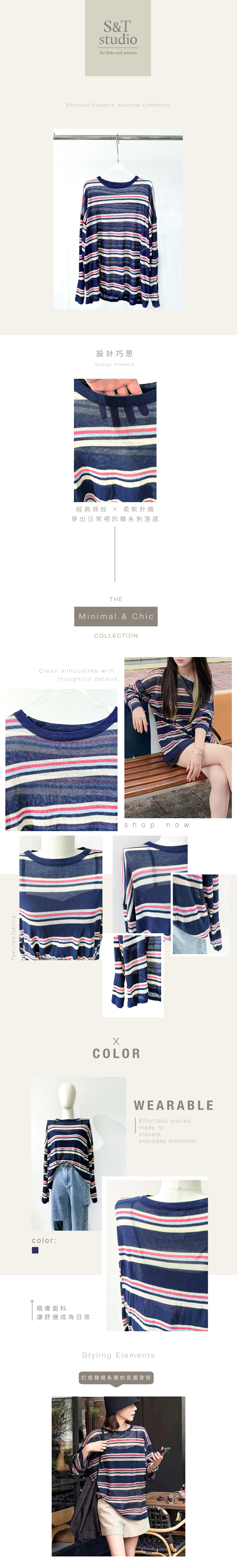 ▹ 以海軍藍為基調,融入紅、白、粉色條紋,展現簡約卻不失層次的時髦感。