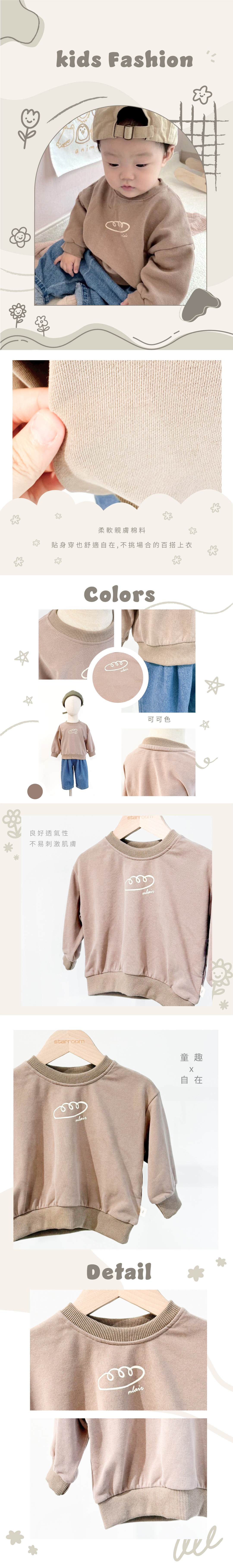 ▹ 用柔和咖色描繪出秋日的味道,胸前手繪麵包插畫,是童趣的日常小細節。