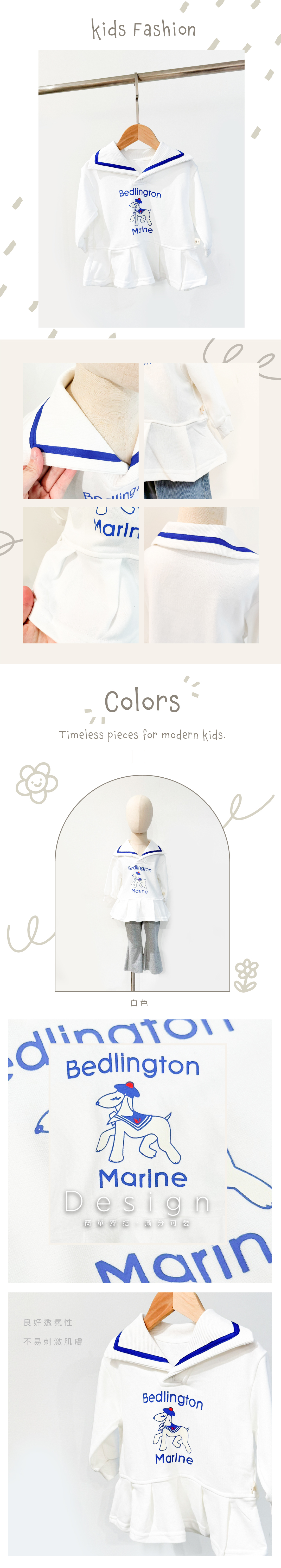 ▹ 柔軟舒適的棉質面料,搭配標誌性的藍白海軍領,再加上俏皮的狗狗插畫,下擺微微抓皺,讓每一步都有可愛的律動感。