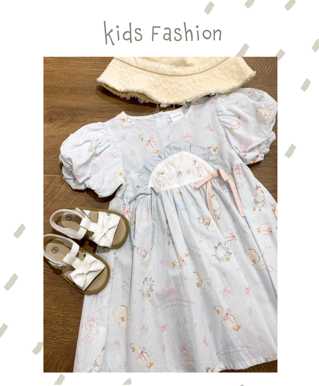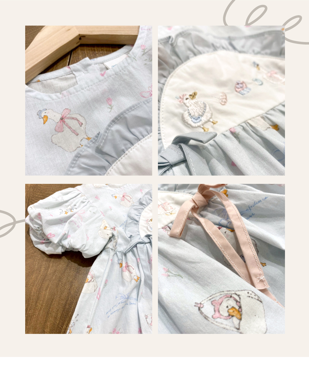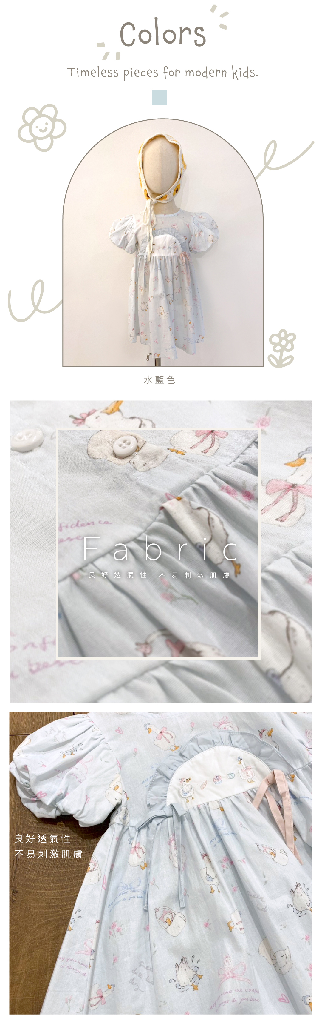 ▹鴨鴨圖案太萌啦! 配上澎澎泡泡袖+舒適棉料裙身,