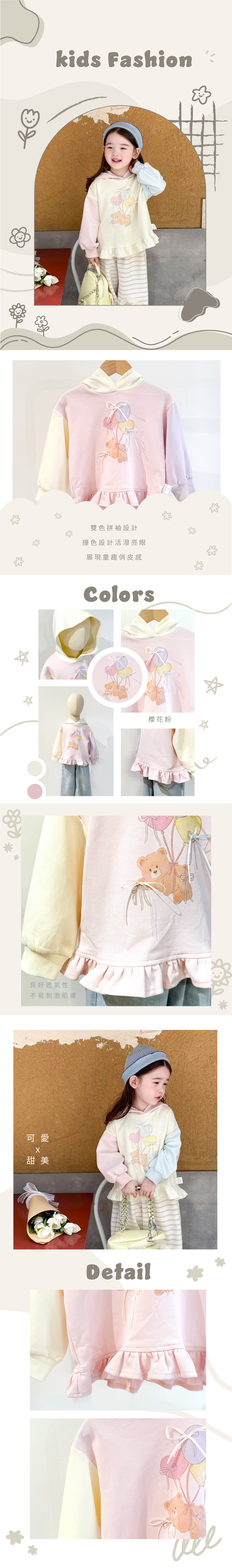 ▹ 夢幻粉系搭配插畫感熊熊圖案,拼接奶油黃色跟紫色袖子,荷葉邊下擺設計更添小女孩的甜美感,可愛中帶有精緻感。