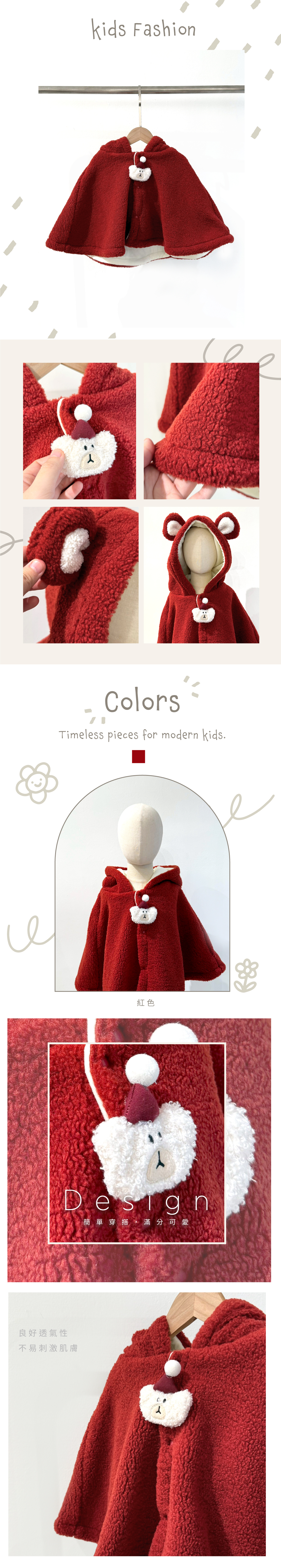 披風式剪裁,活動自在不束縛,方便穿脫,適合外出、居家與學校保暖。