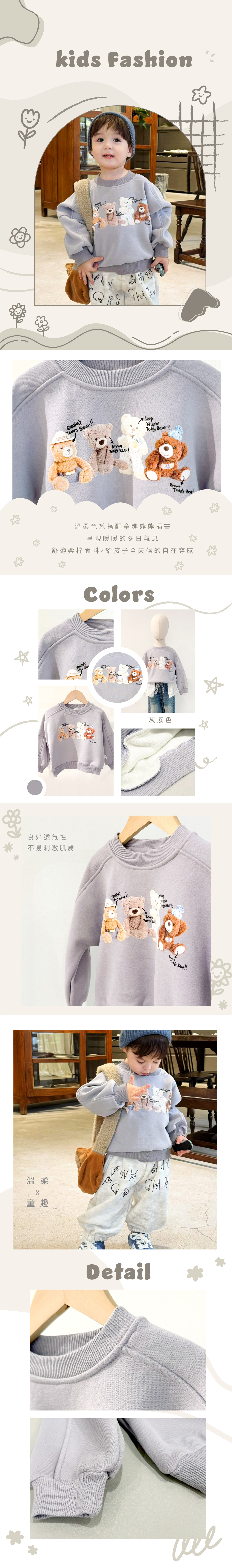 ▹ 前胸四隻小熊搭配英文字母,童趣又可愛,柔軟內刷毛,保暖舒適,適合秋冬穿搭。灰紫色調,低調又有質感,男女童皆適合。