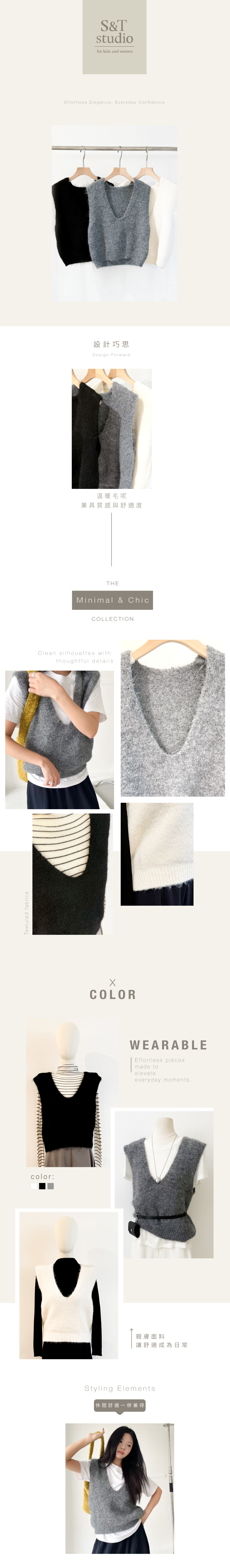 這件針織背心帶點毛感蓬鬆,深V設計讓層次感更突出,適合與襯衫或長袖內搭. 微厚短袖做疊穿,讓日常多一分溫度,也多一點從容。