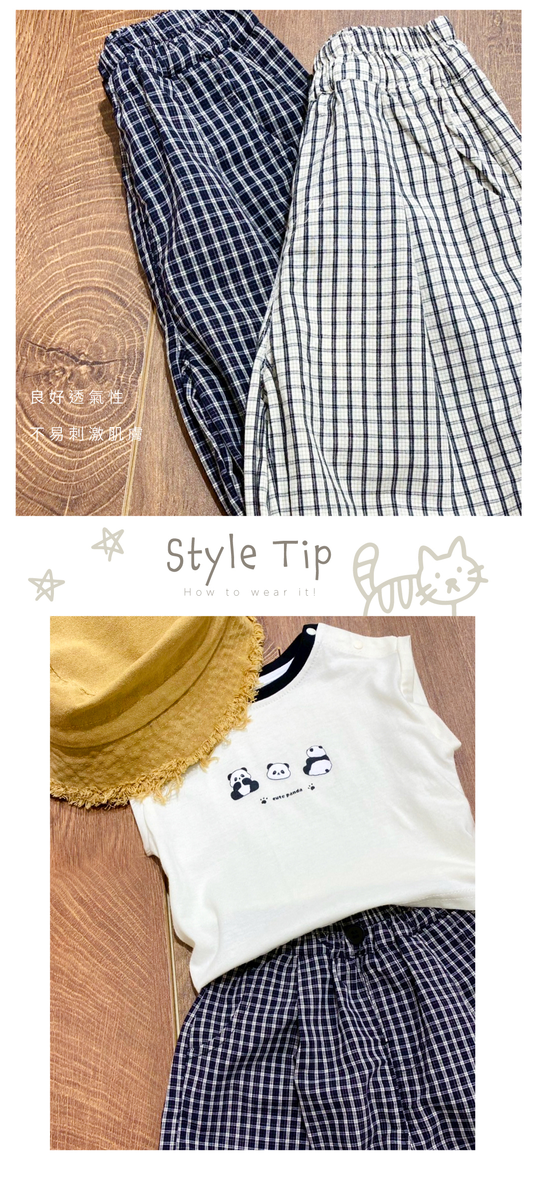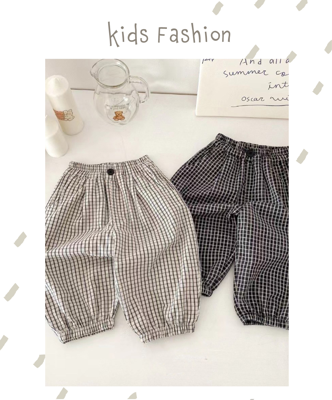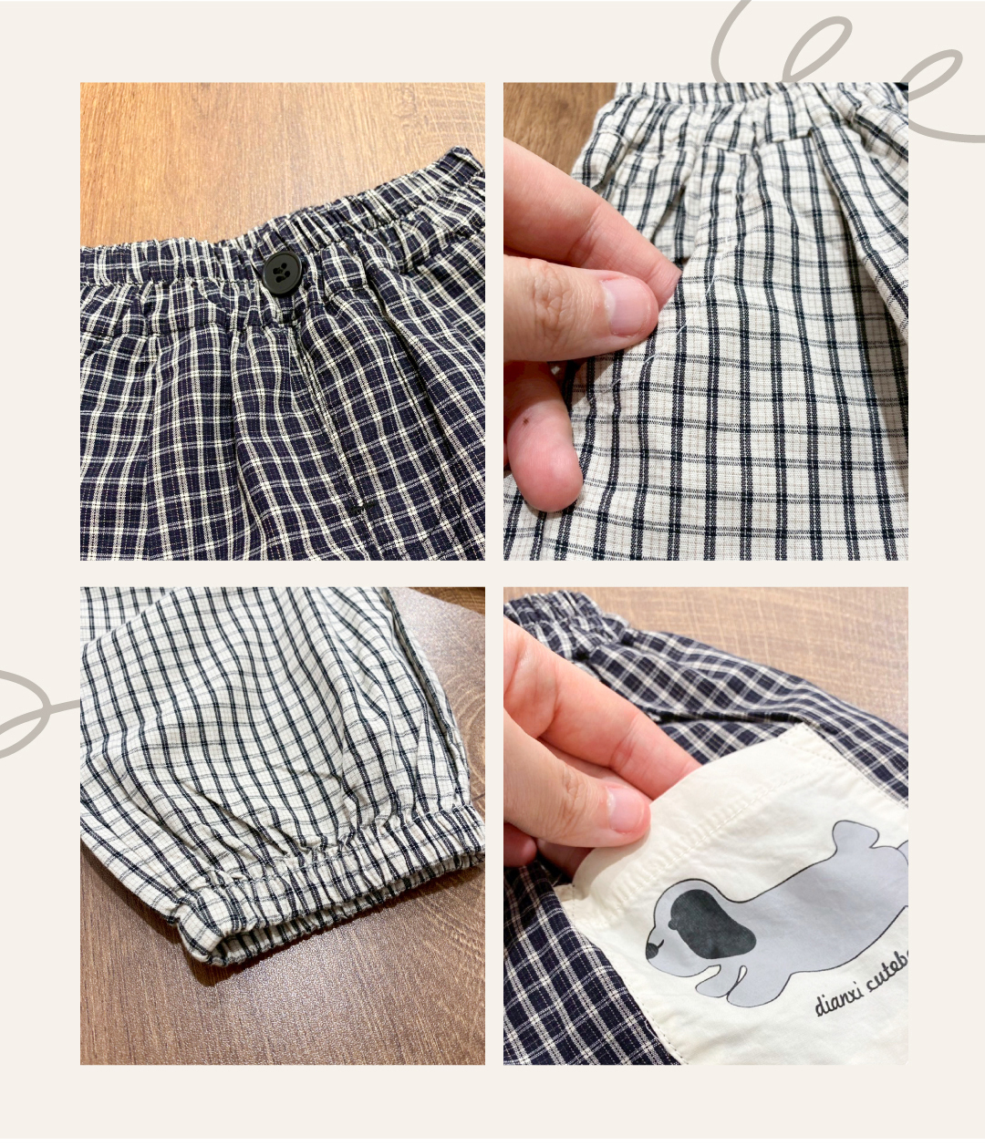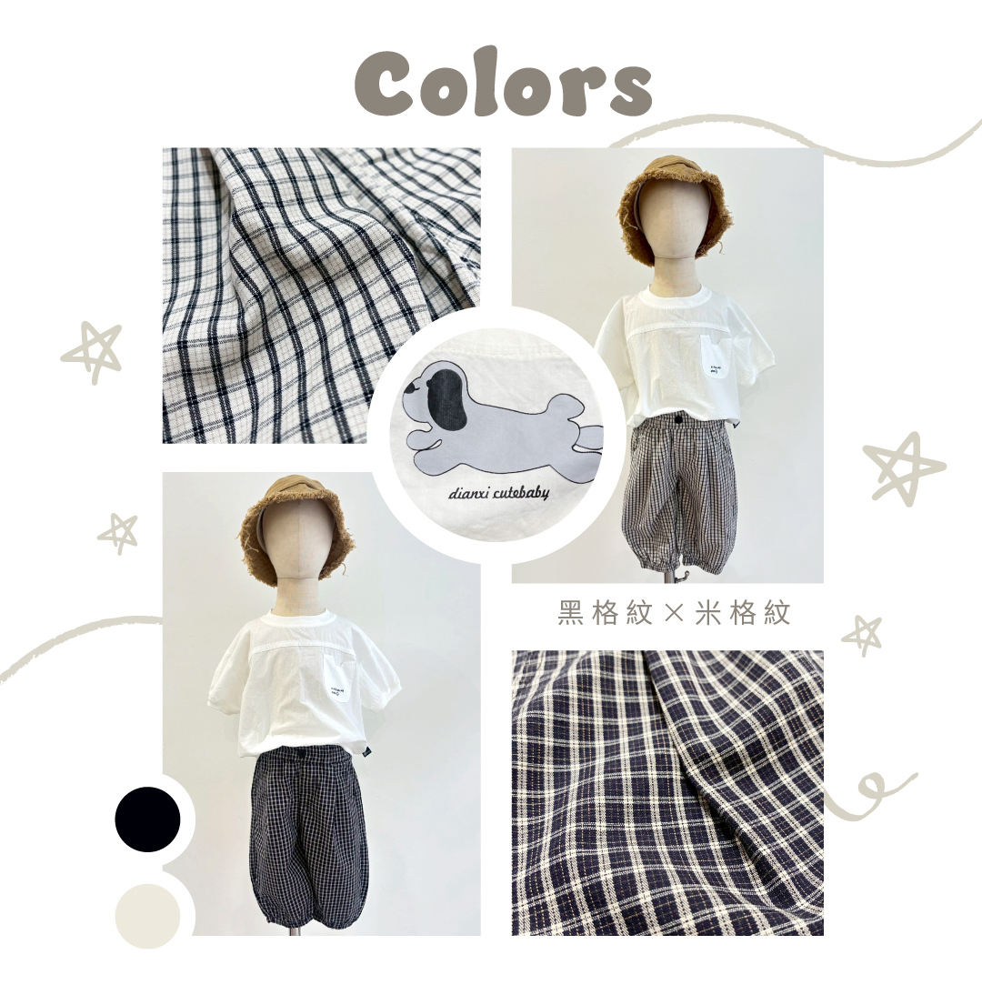 ▹細格紋設計後狗狗塗鴉口袋充滿童趣感,縮口褲型更顯俐落可愛