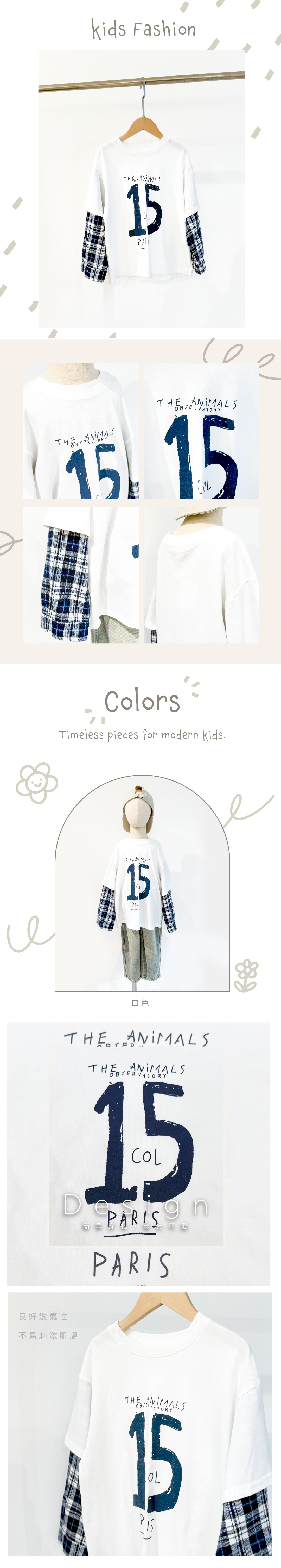 ▹ 純白T恤搭配內層深藍格紋拼接袖假兩件式,營造自然層次感,既有個性又輕鬆穿搭。