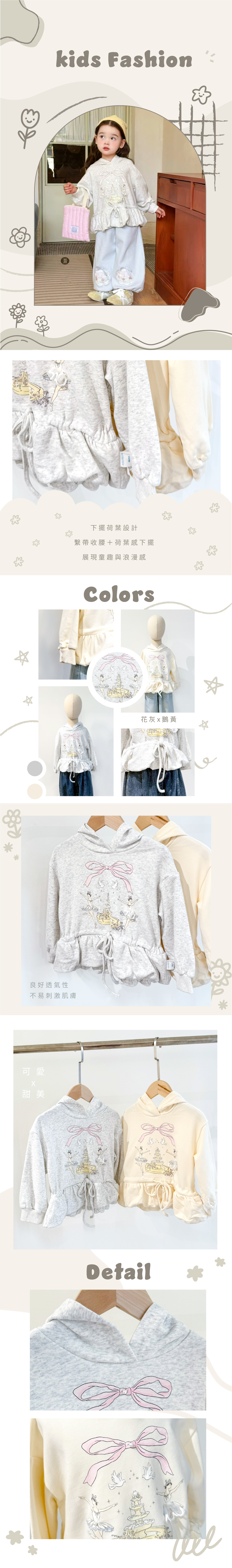 ▹ 童趣感滿分的蝴蝶結連帽設計,搭配插畫風夢幻蛋糕塔圖案,讓寶貝一秒化身為森林裡的甜心小公主。