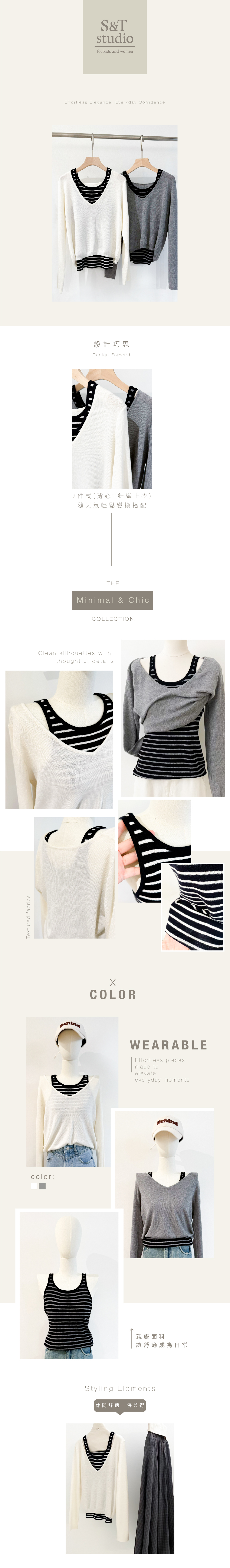 ▹ 一件搞定穿搭層次,日常也能輕鬆有型。內搭條紋背心+外罩V領針織衫,兩件組合設計,可單穿、可分開搭配,隨心變化穿搭風格。
