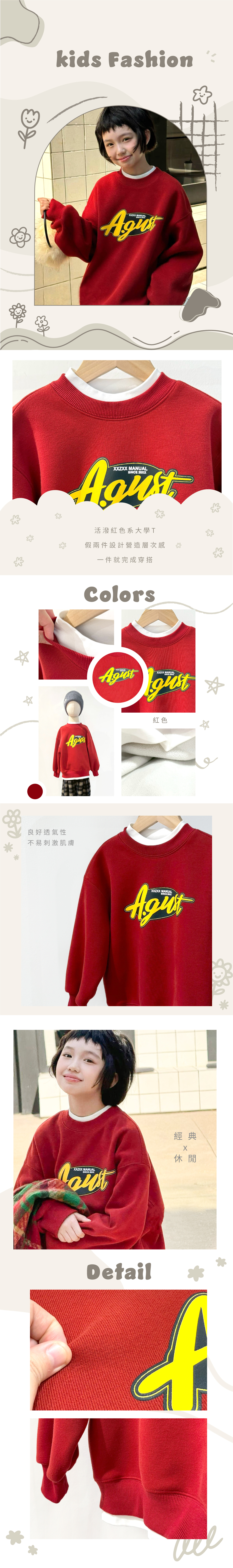 ▹ 經典紅色系搭配假兩件設計,層次感一件完成,穿搭更有型,亮黃色英文字母印花,美式校園風格,活潑又吸睛。