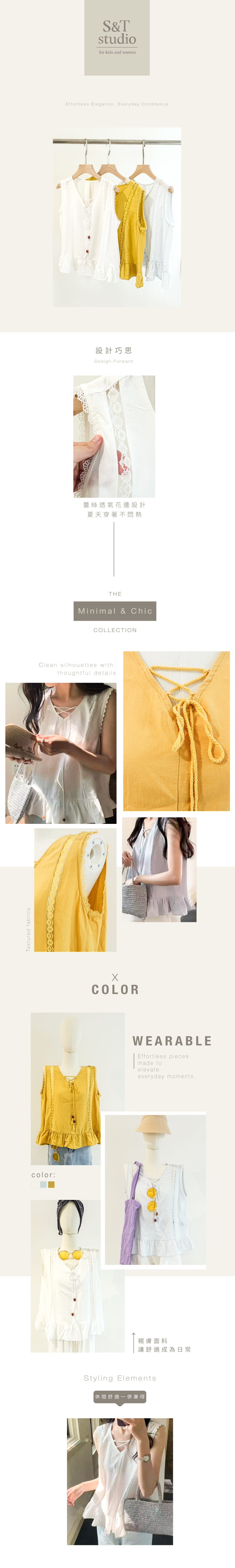 無袖設計讓肩頸線條更顯修長,搭配微荷葉下擺,展現不經意的優雅氛圍。