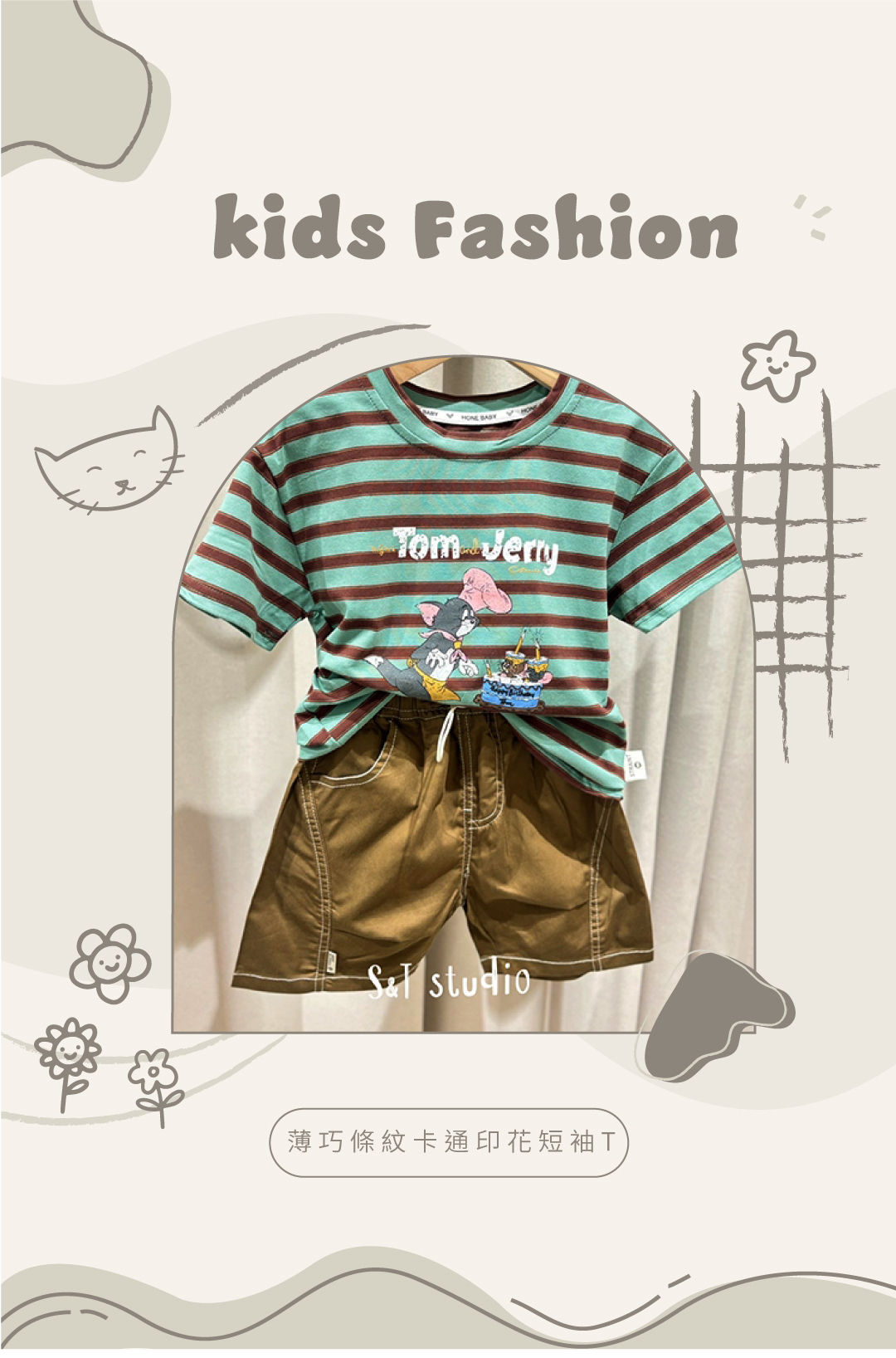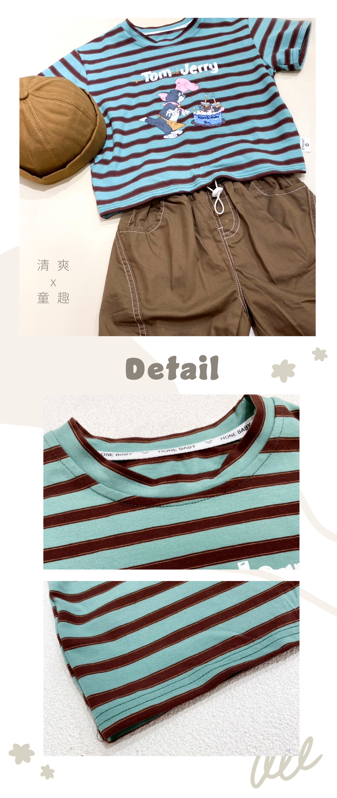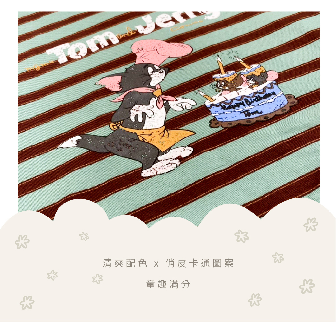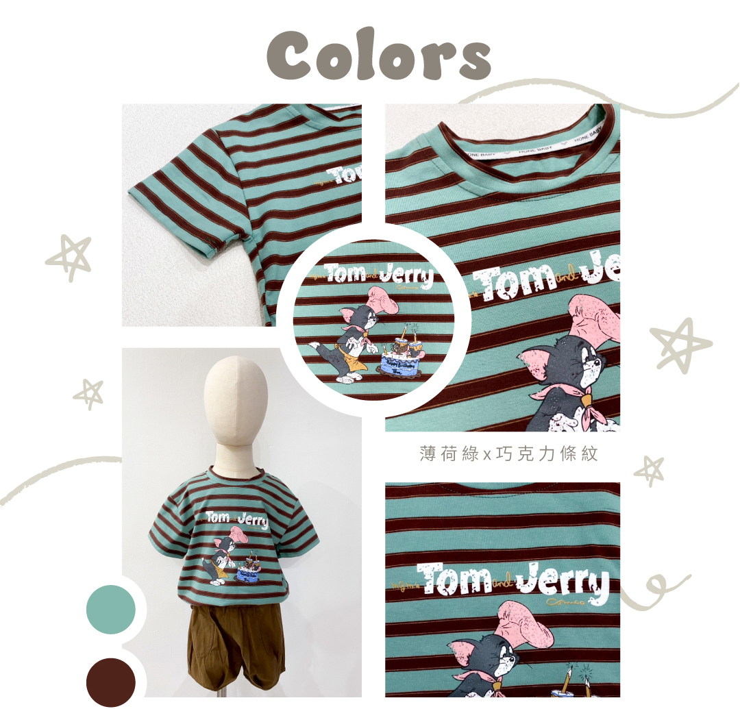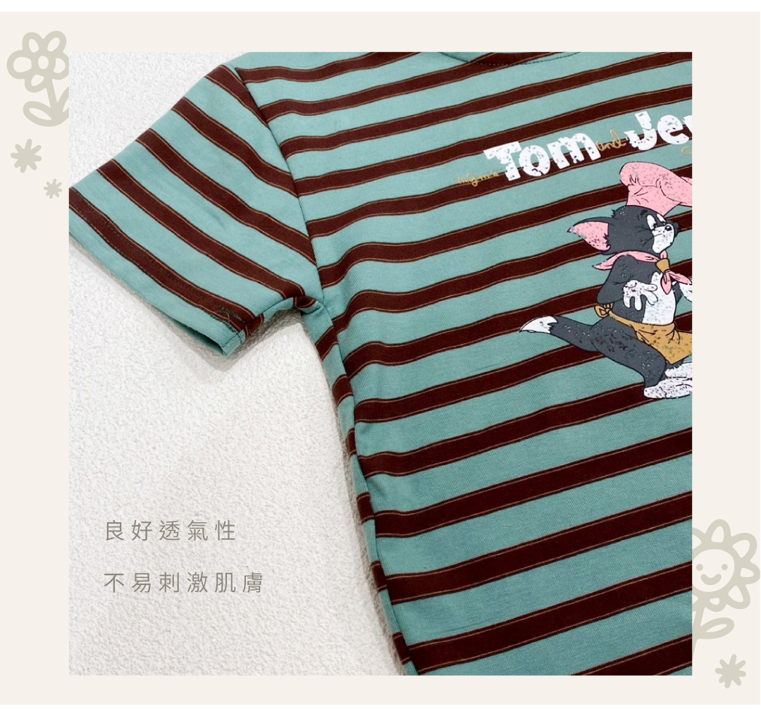 ▹綠棕條紋T搭配TOM & JERRY可愛插畫
