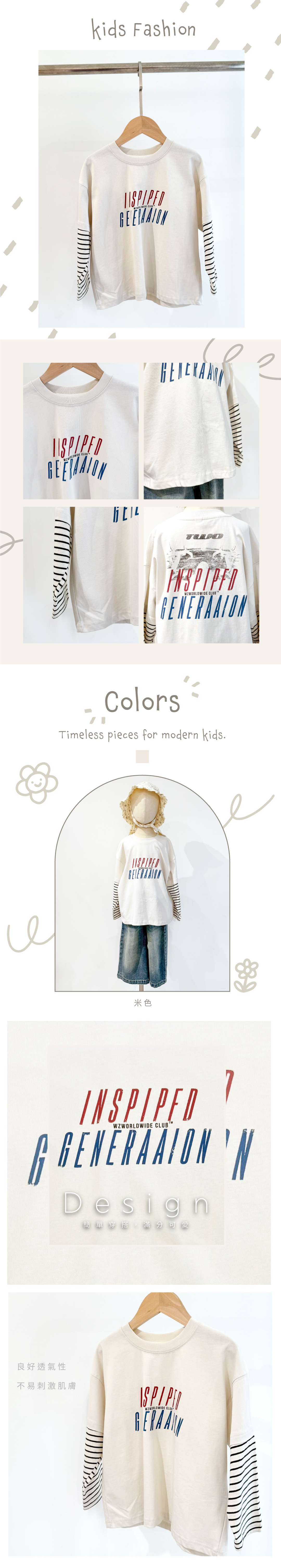 這款男女童皆可穿的假兩件上衣,結合純色字母T與條紋拼接長袖,一件穿出兩件的層次感,輕鬆營造出韓系文青小朋友風格。