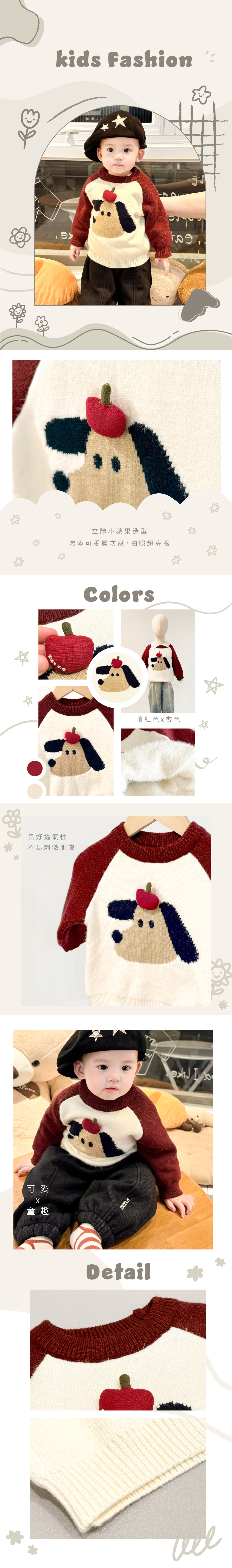 胸前立體小蘋果點綴,與萌狗狗圖案結合,呈現童趣滿滿的插畫風。