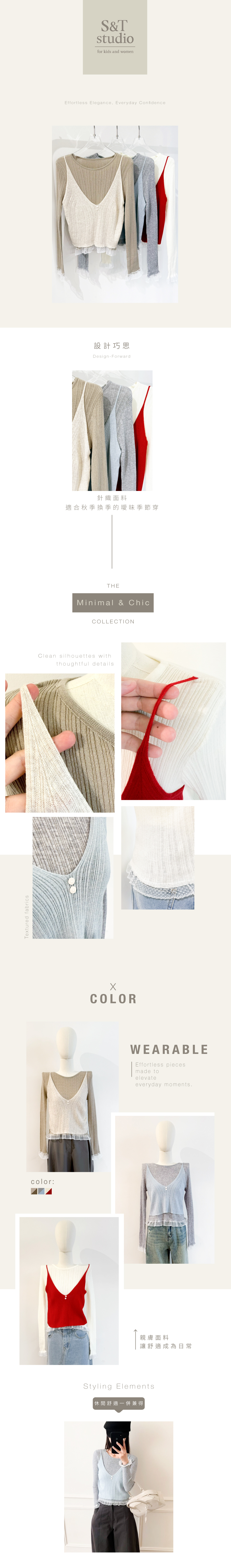 ▹ 針織 × 層次感,穿出不費力的韓系日常感。以簡約俐落為主軸,結合細針織長袖與微透紗拼接感背心,不需要思考太多,就能有造型感。