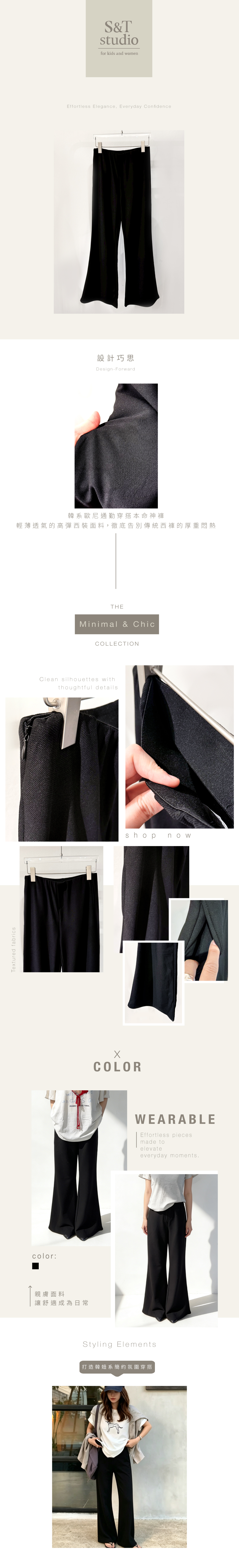 布料帶有自然垂墜感,使喇叭線條順勢展開,修飾小腿與腿型曲線,讓整體比例更顯修長俐落